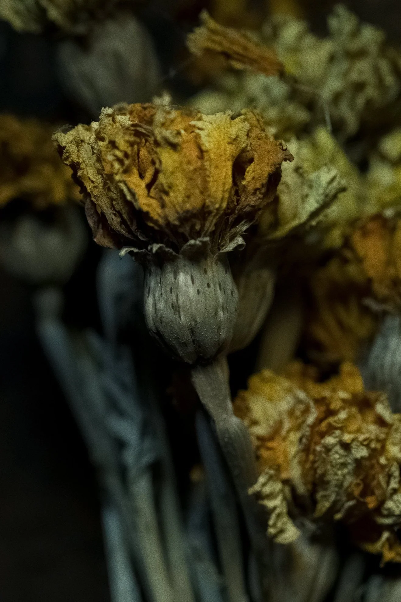 La rencontre de plusieurs éléments, la lumière très particulière de cet endroit aux murs sombres éclairés par une seule fenêtre, l’accumulation et le séchage de toutes ces fleurs suspendues à l’envers ont créé un studio photo unique dans une lumière naturelle aux dominantes changeantes parfois chaudes parfois froides en fonction de la journée.