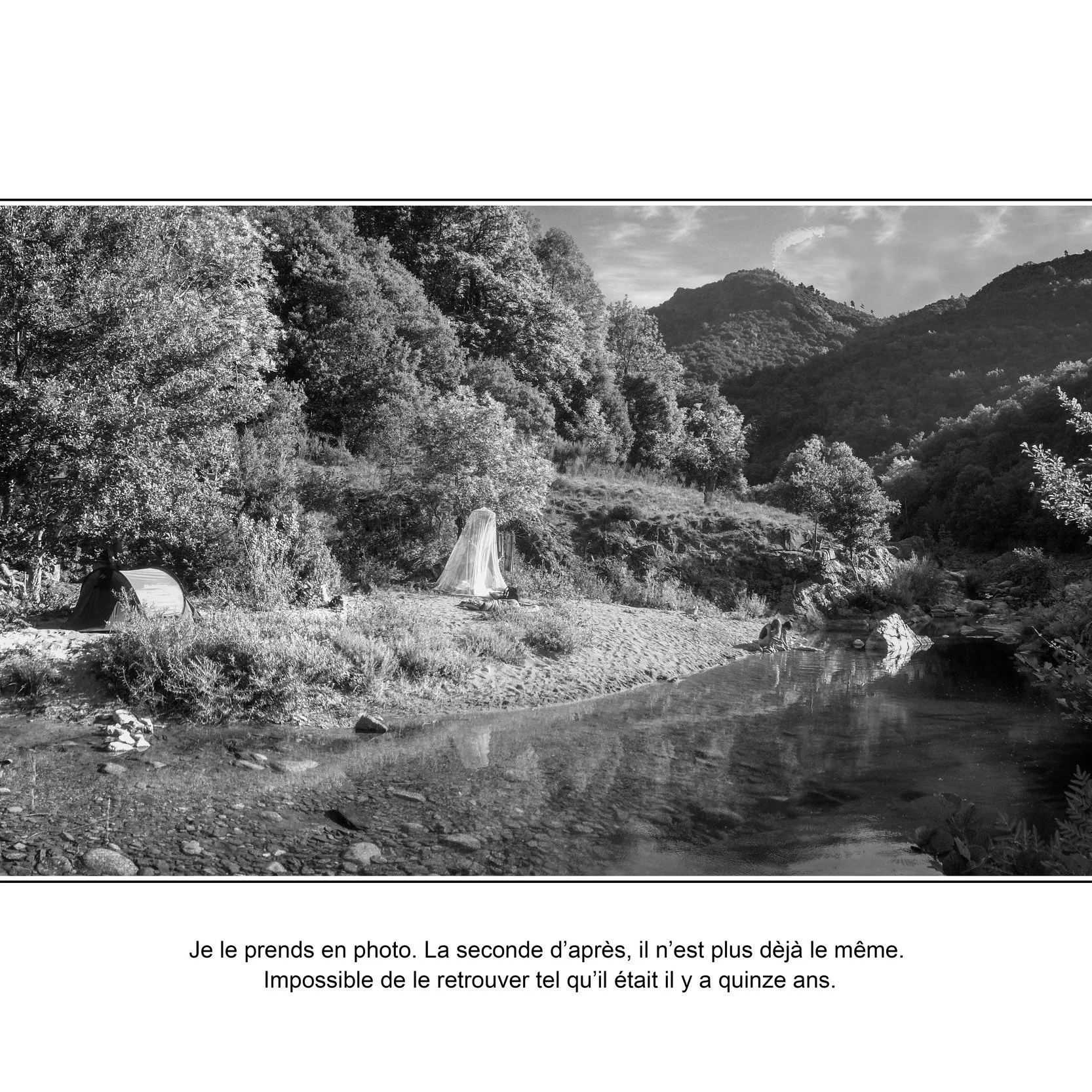 "Désir de vacances - Un roman-photo au fil de la Thines". Entre hier et aujourd’hui, ce roman photo nous entraîne doucement et tranquillement comme l’eau de la rivière dans un voyage poétique et nostalgique. Ici pas d’illustration, mais des photographies en noir et blanc. La confrontation de ces images hétérogènes, que se soient les archives familiales ou un reportage in situ, dessine en creux le portrait d’une rivière ardéchoise transformée au fil des décennies. » Le temps hémophile, coule. Comme dans la chanson de Souchon » nous rappelle l’auteur Marius Jouanny.